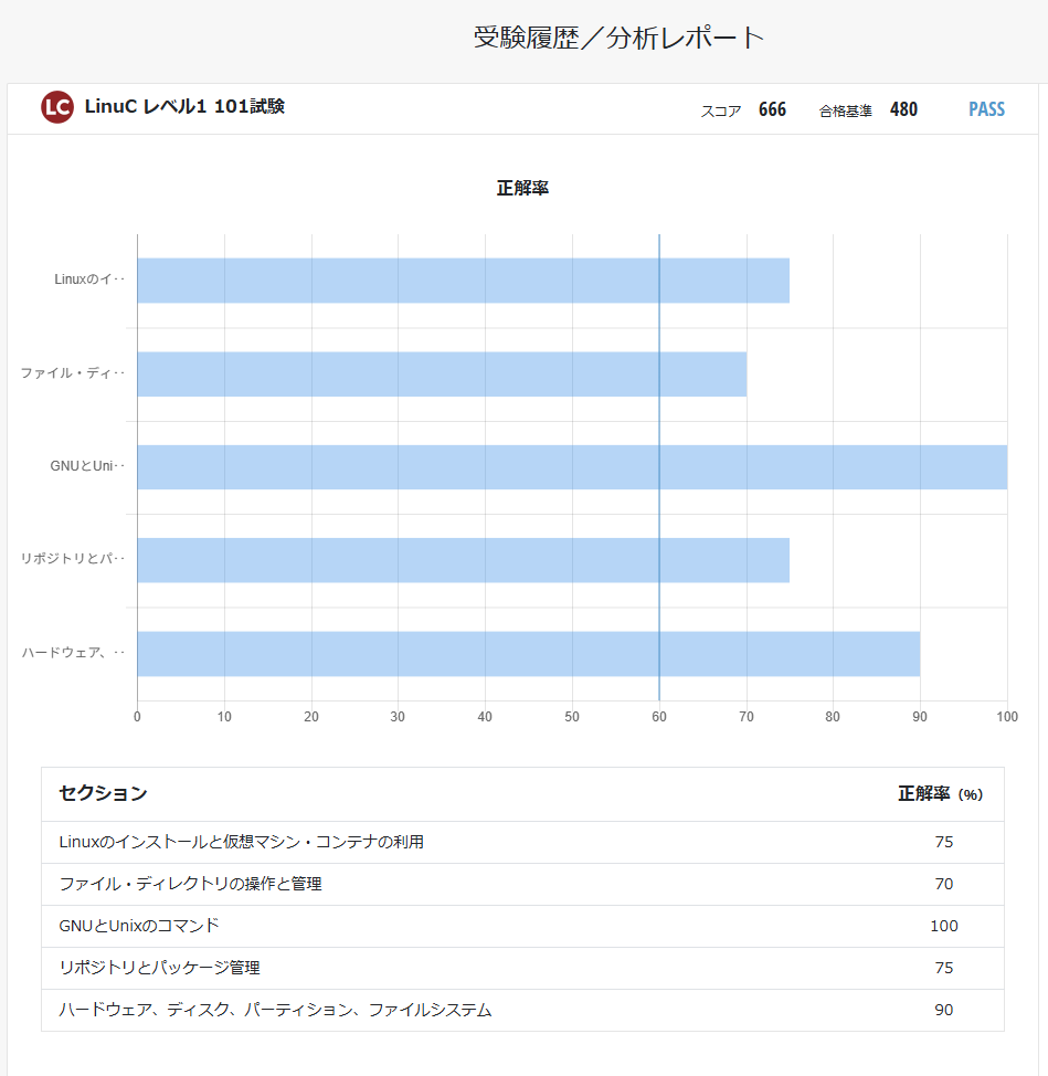 スコアは800点が満点のところ666点(合格基準480点)で無事に合格しました。